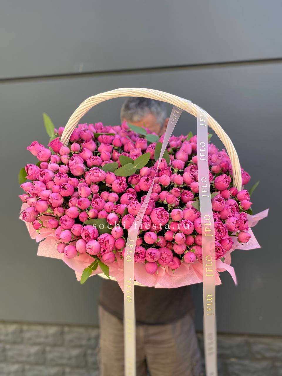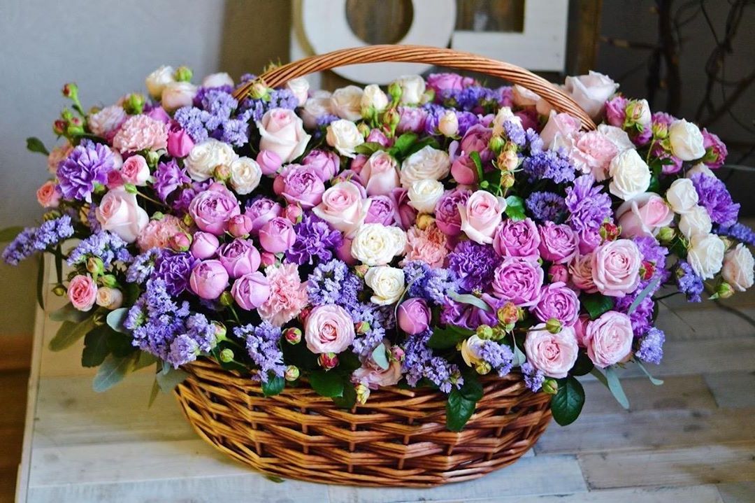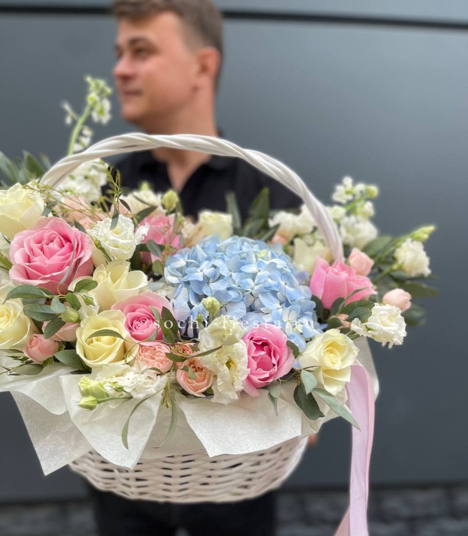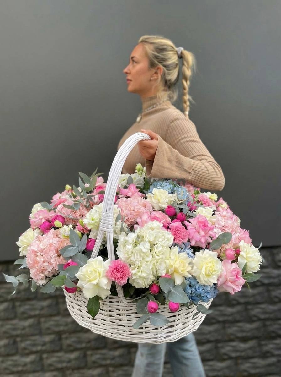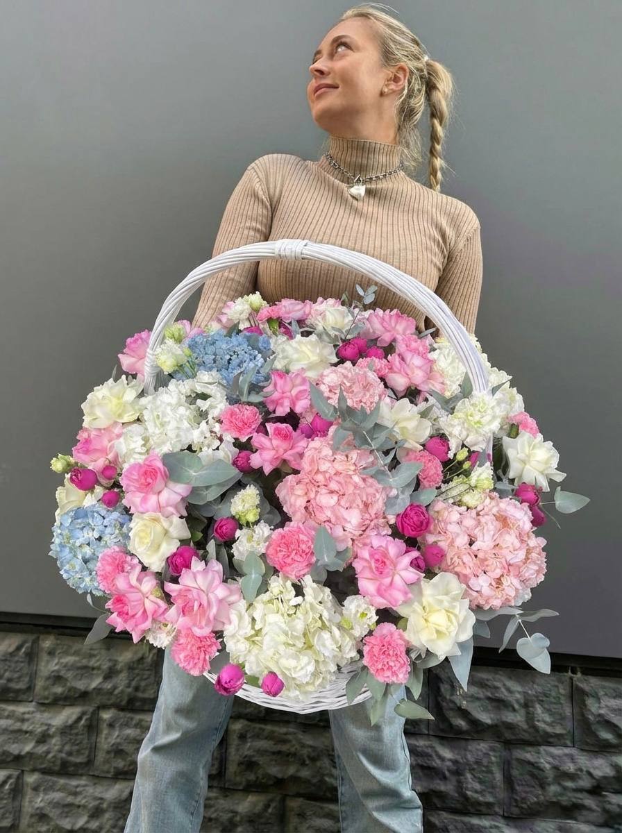 Масштабная корзина объединяет лилии, гортензии, антиринум, розы и эустому в единую объёмную композицию. Высота и насыщенность каждого слоя создают впечатление цветочного изобилия.