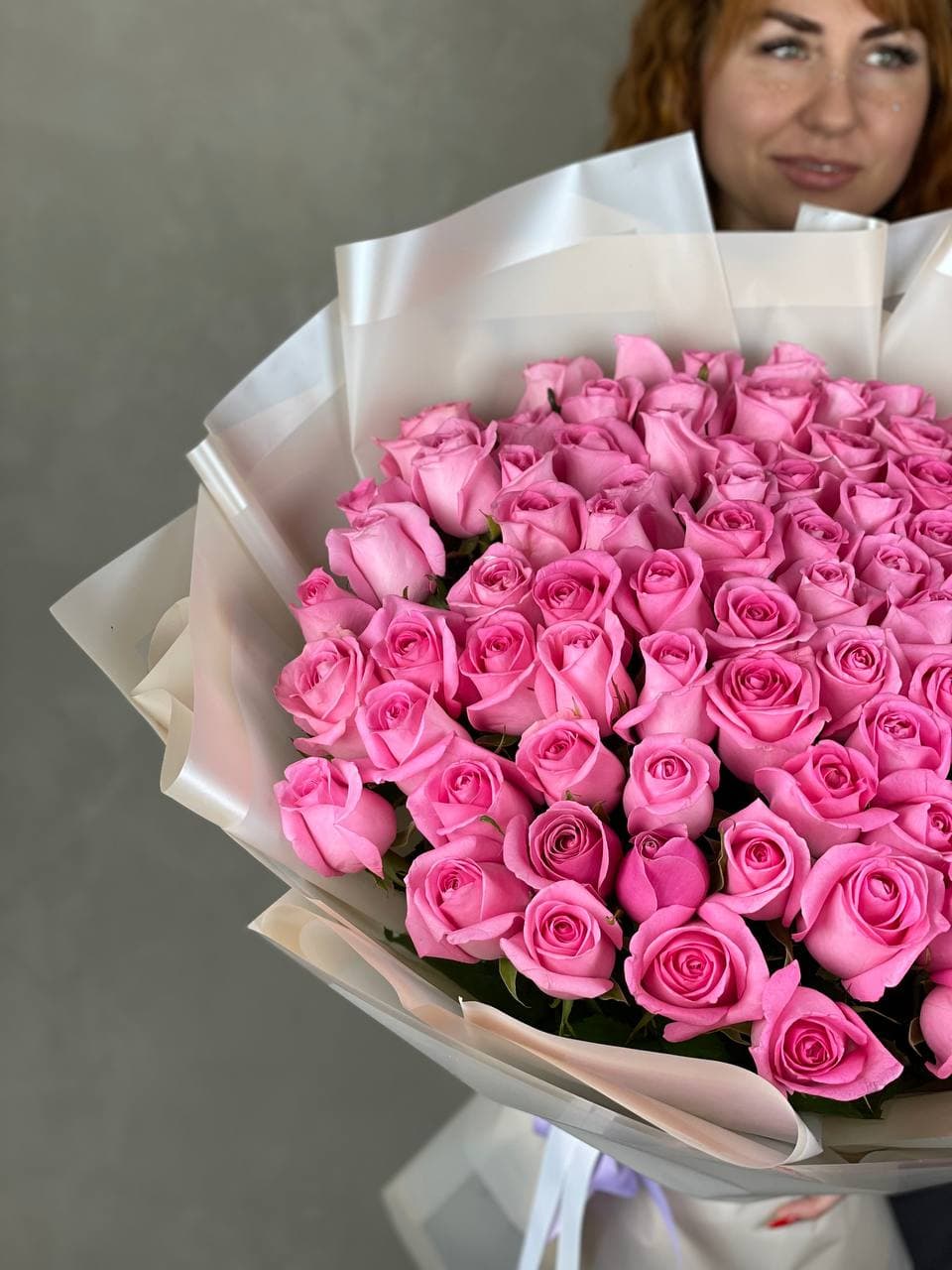 Сто одна белая роза собрана в впечатляющую охапку. Монохромная гамма и повторяющийся ритм бутонов создают мощное визуальное присутствие. Такой объём заполняет пространство и приковывает внимание.