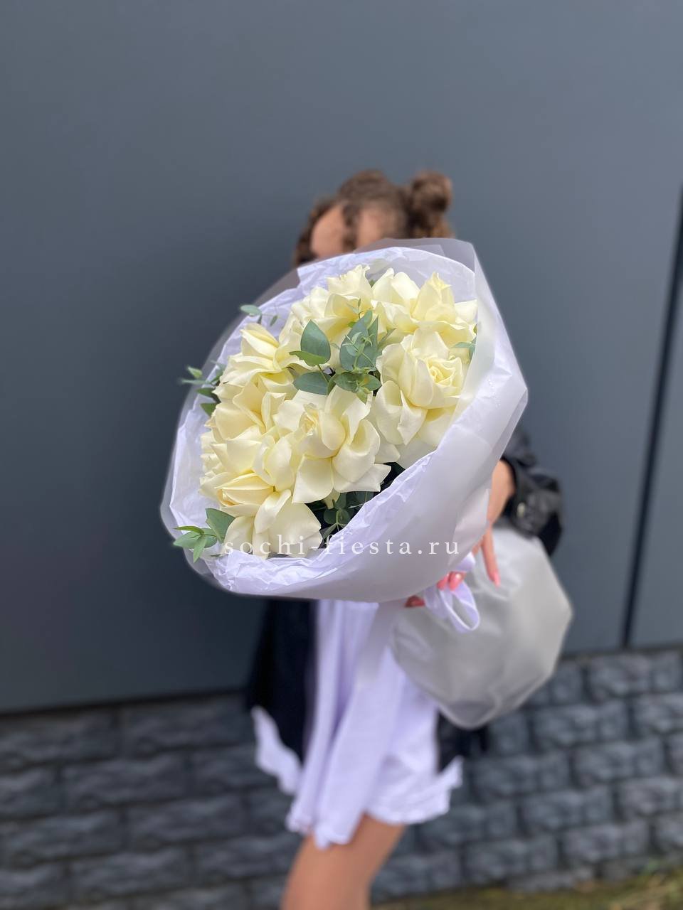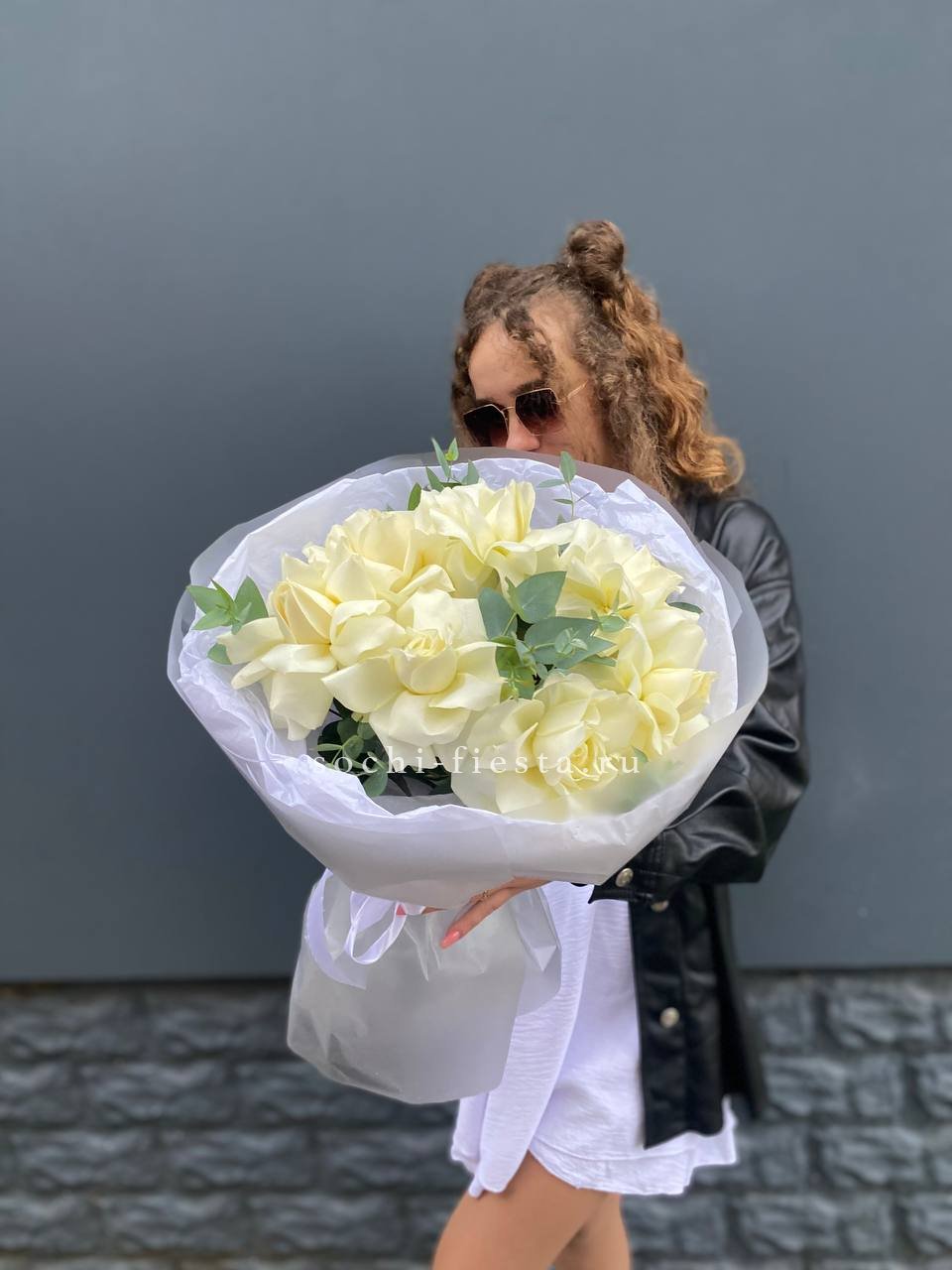 Плотная охапка кремовых роз с мягким переходом оттенков от сливочного до топленого молока. Бутоны собраны без зазоров, образуя округлую форму с естественным объемом. Атласная лента фиксирует стебли и завершает композицию.