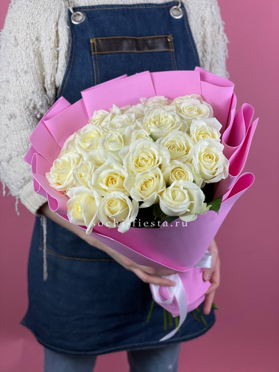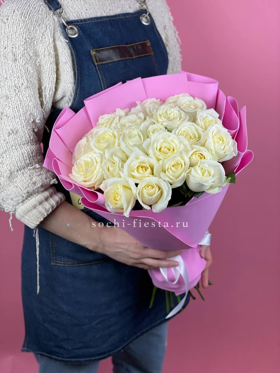Двадцать пять белых роз образуют объёмную композицию с выразительным силуэтом. Плотная сборка и ритмичное расположение бутонов создают графичное впечатление.