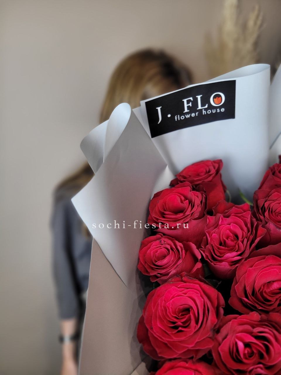 Пятнадцать красных роз в лаконичной упаковке держат безупречную вертикаль и собраны так плотно, что линия букета остаётся чёткой и графичной. Форма читается с любого угла и не теряет выразительности даже в высоких вазах.