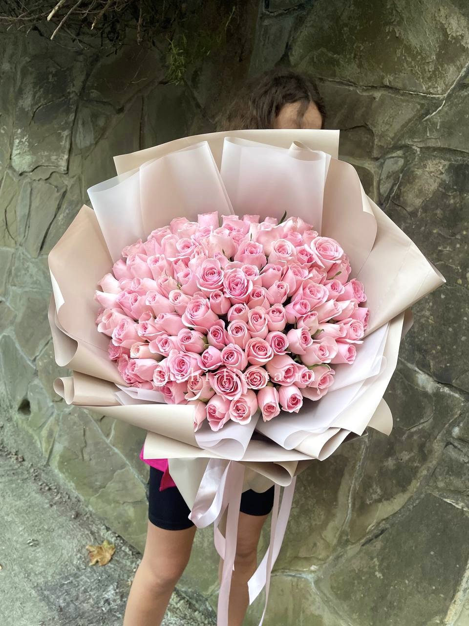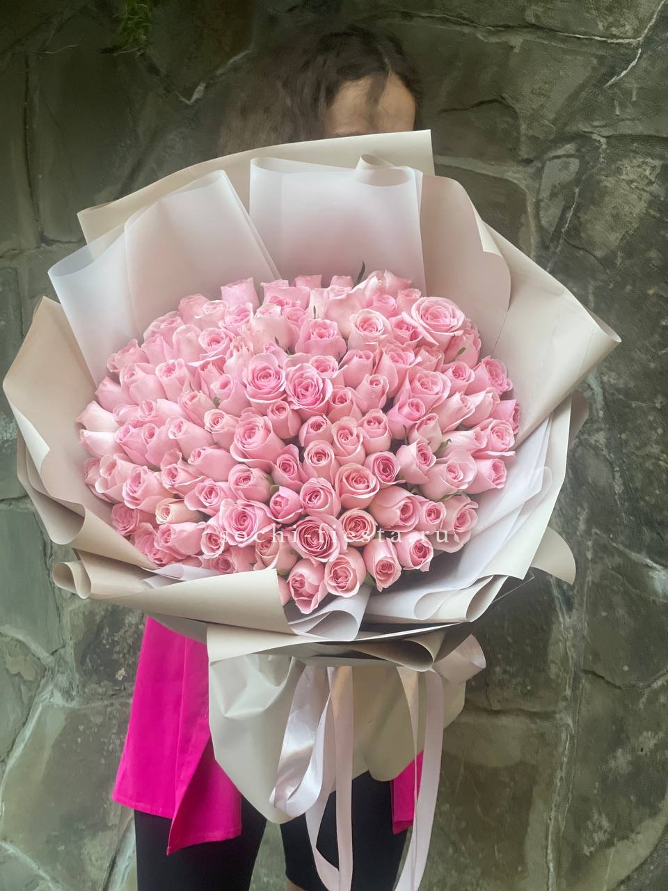 роза розовая - 101 шт., лента, белая дизайнерская бумага.