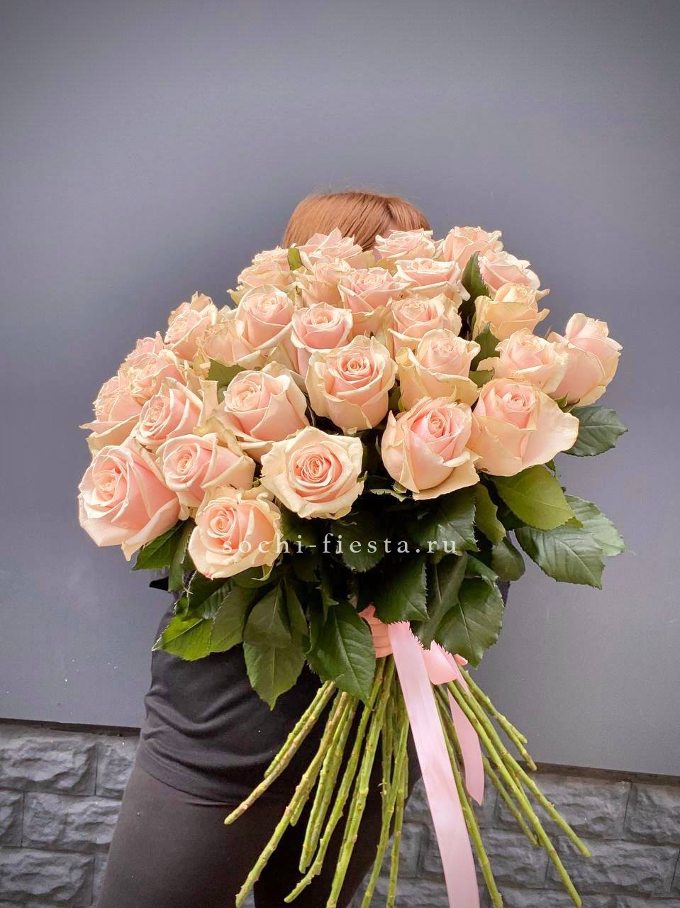 Сто одна роза в кремовых тонах — масштабная композиция с выразительным объемом. Букет наполняет пространство и создает запоминающееся визуальное присутствие.