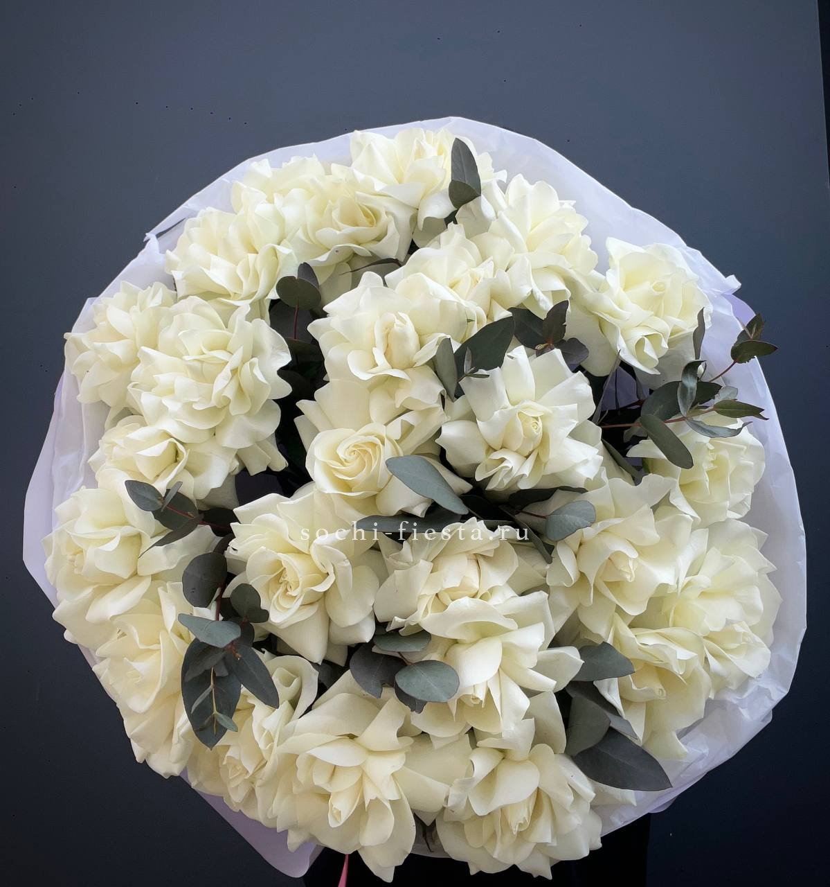 Тринадцать вывернутых французских роз сочетаются с серебристым эвкалиптом. Белые головки с волнистыми лепестками образуют воздушное облако.