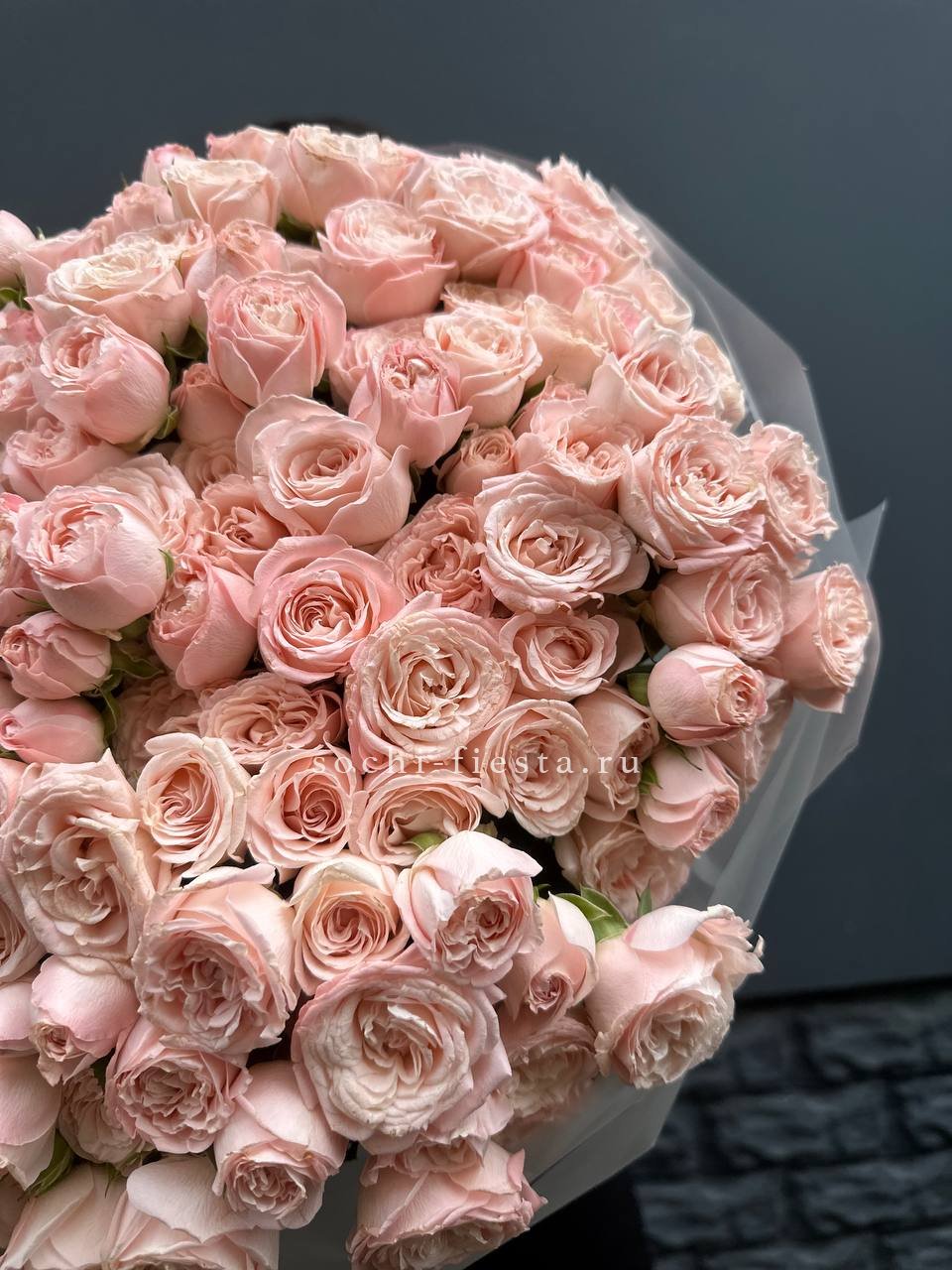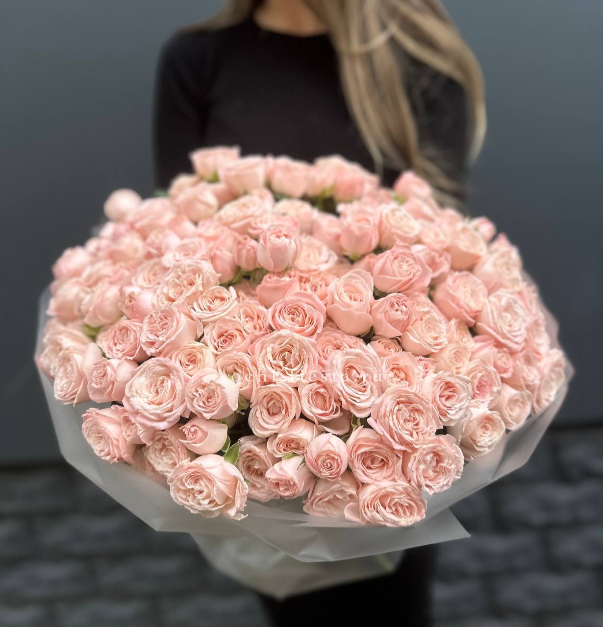 Сто одна кустовая роза Барбадос создаёт впечатляющий объём и визуальную мощь. Множество бутонов формируют плотную структуру с выразительным силуэтом. Композиция наполняет пространство и приковывает взгляд.