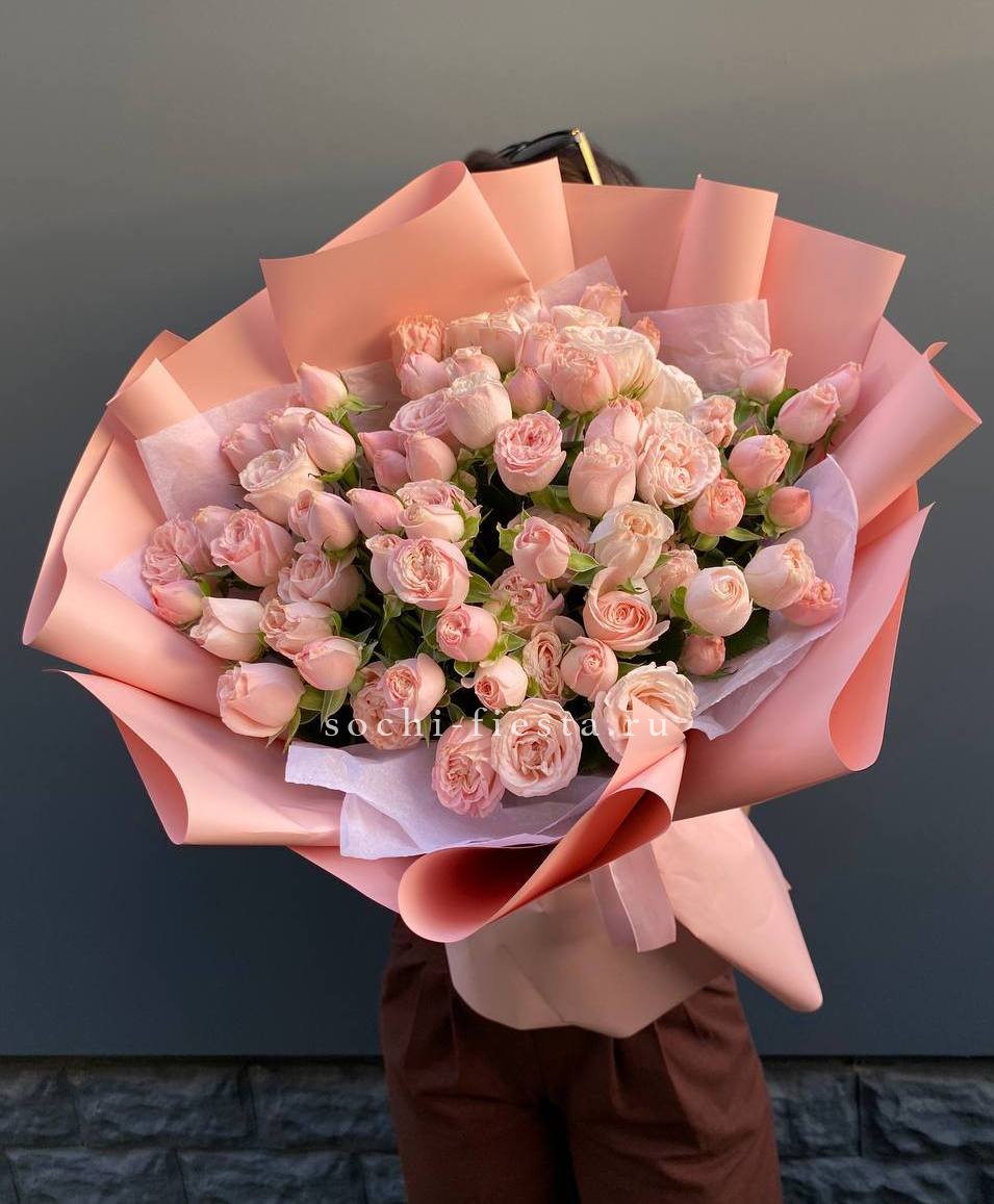 Двадцать пять кустовых роз Бомбастик собраны в пышную композицию с выраженной округлой формой. Плотные многолепестковые бутоны располагаются близко друг к другу, создавая насыщенный визуальный ритм и объемную структуру букета.