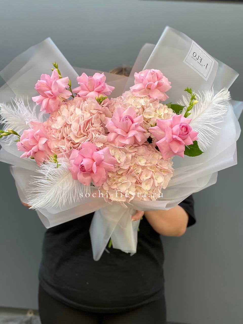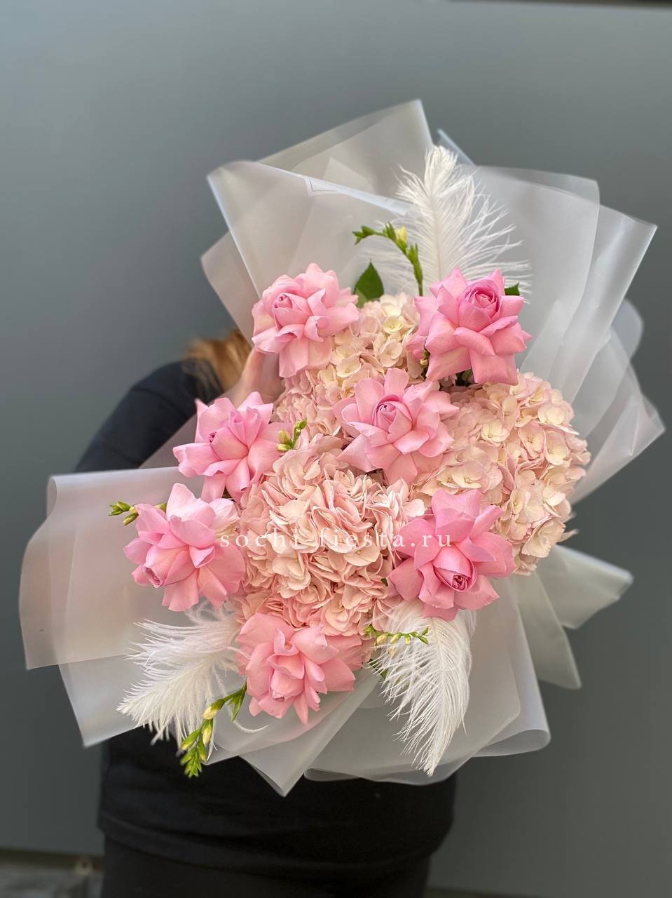 Пушистые шапки Мисти Бабблс переплетаются с классическими розовыми бутонами, создавая объёмный силуэт с мягкими переходами. Композиция собрана плотно, каждый цветок занимает своё место в общем ритме.