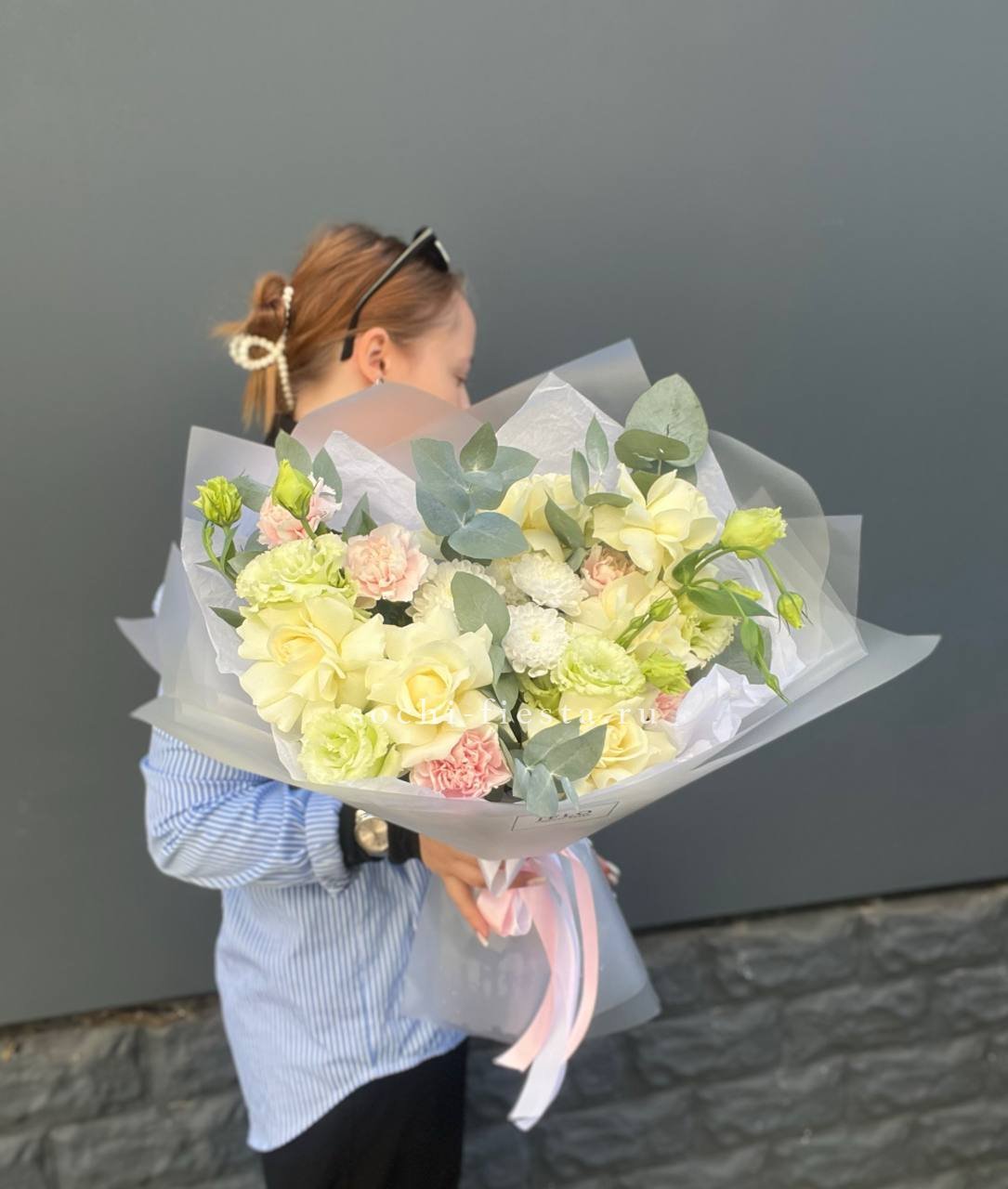диантус, бомбастик, белые розы, эвкалипт, эустома, упаковка.