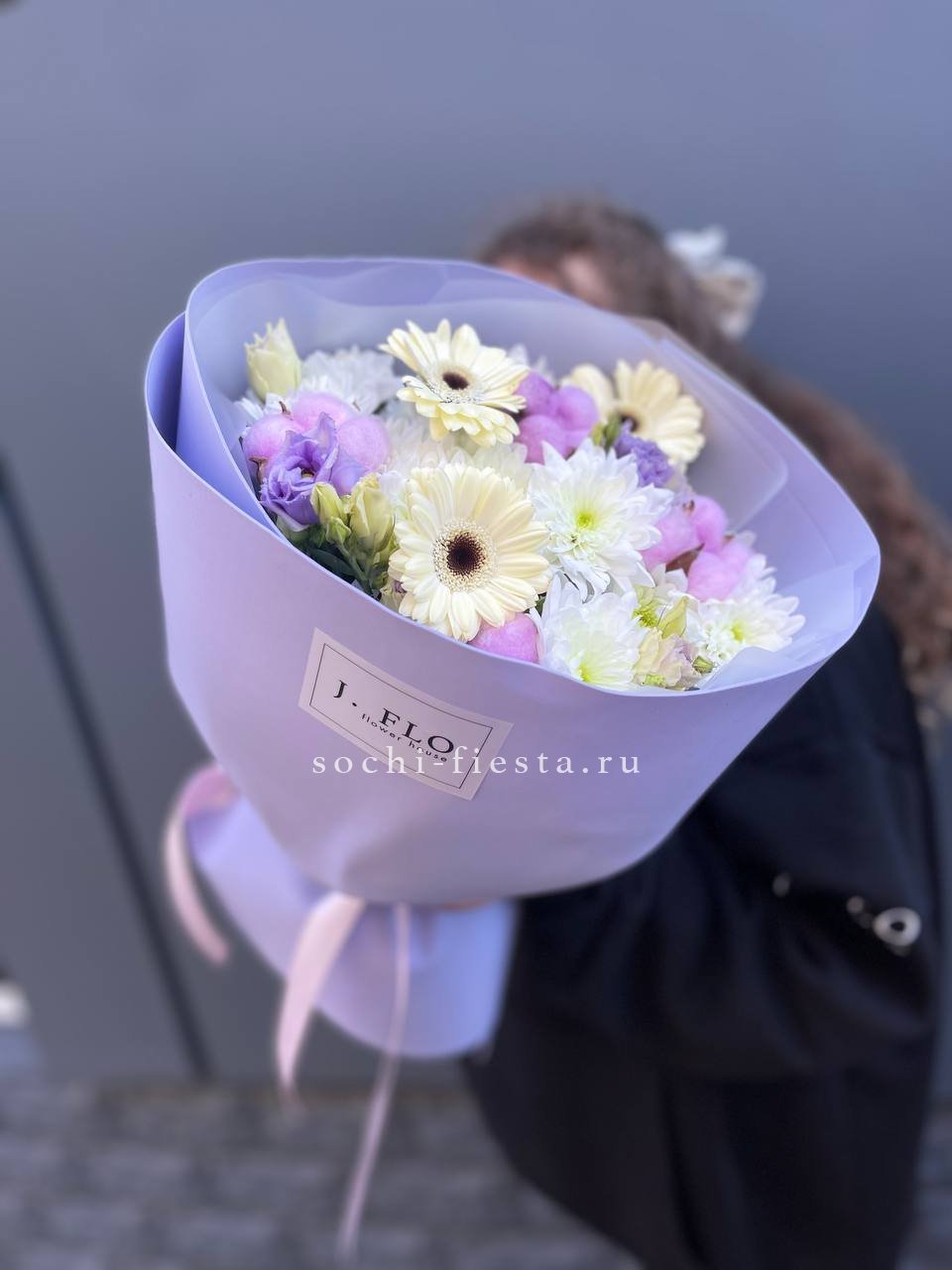 Герберы и хризантемы выстраивают яркую композицию, где каждый бутон читается отдельно. Хлопок добавляет фактурный акцент, а эустома смягчает переходы между соцветиями.