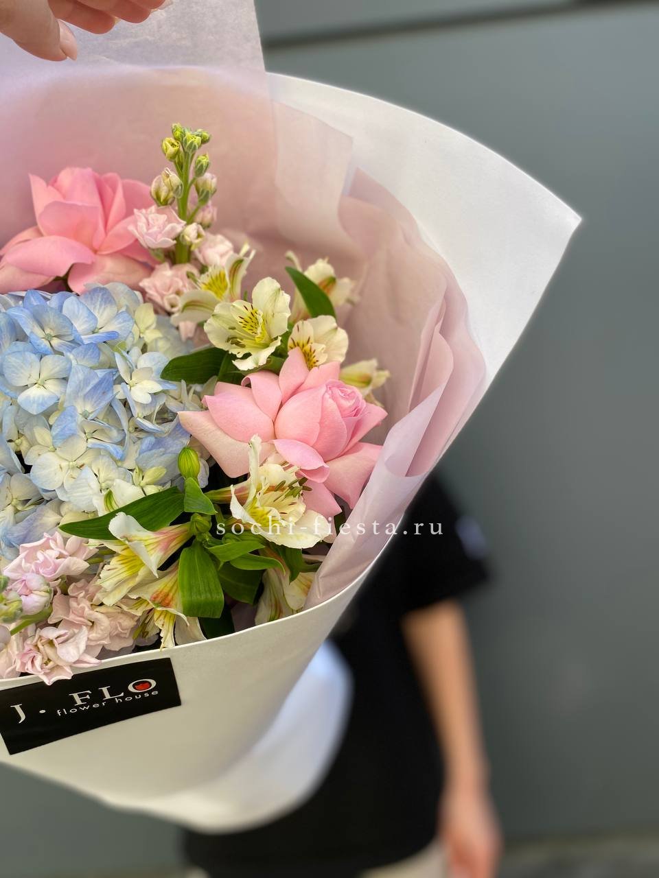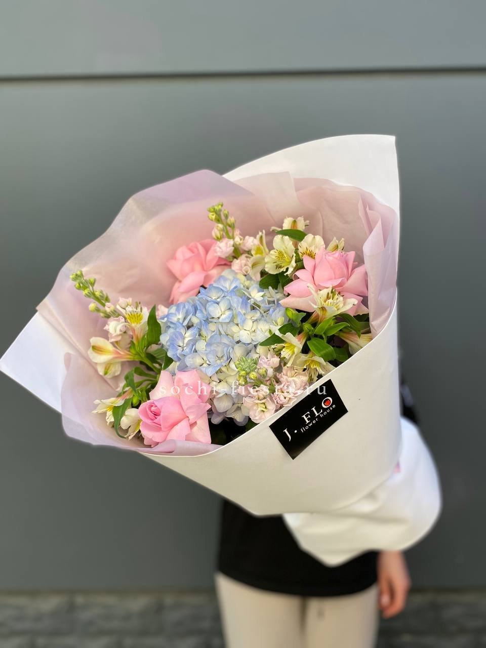 Пышные шапки гортензии задают объём, а россыпь кустовых роз создаёт живую текстуру по всей форме. Композиция наполнена воздухом и естественной лёгкостью.