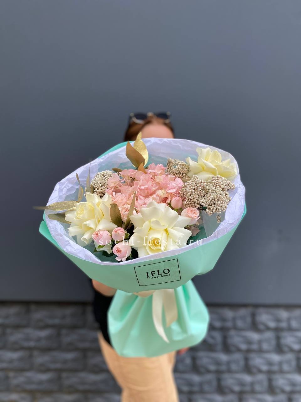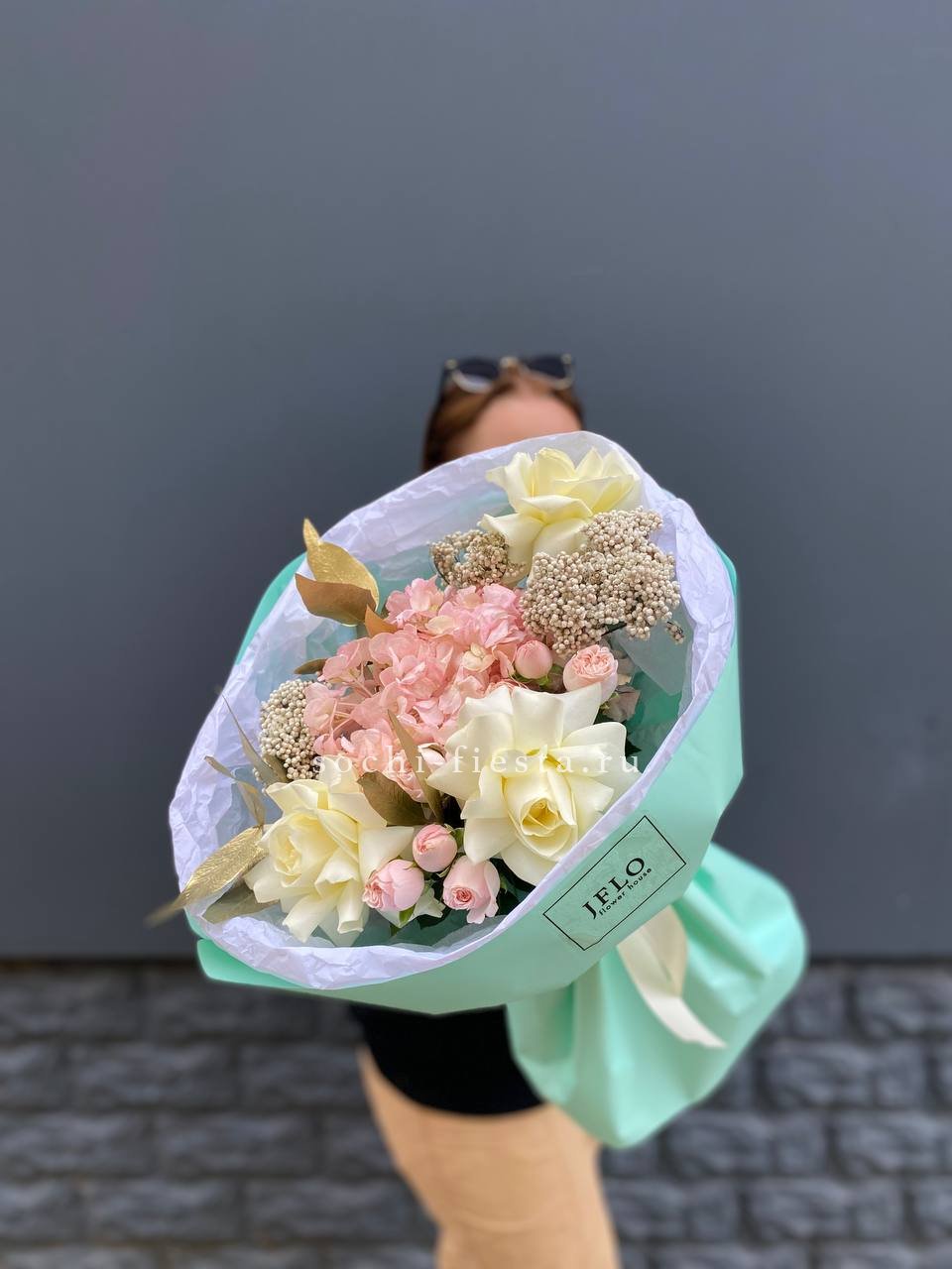 гортензия, хризантема, хамелациум, гербера, мисти баблс, диантус, пленка.