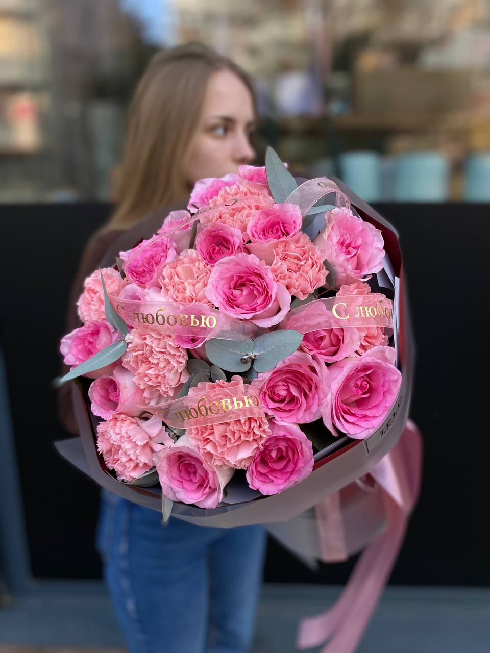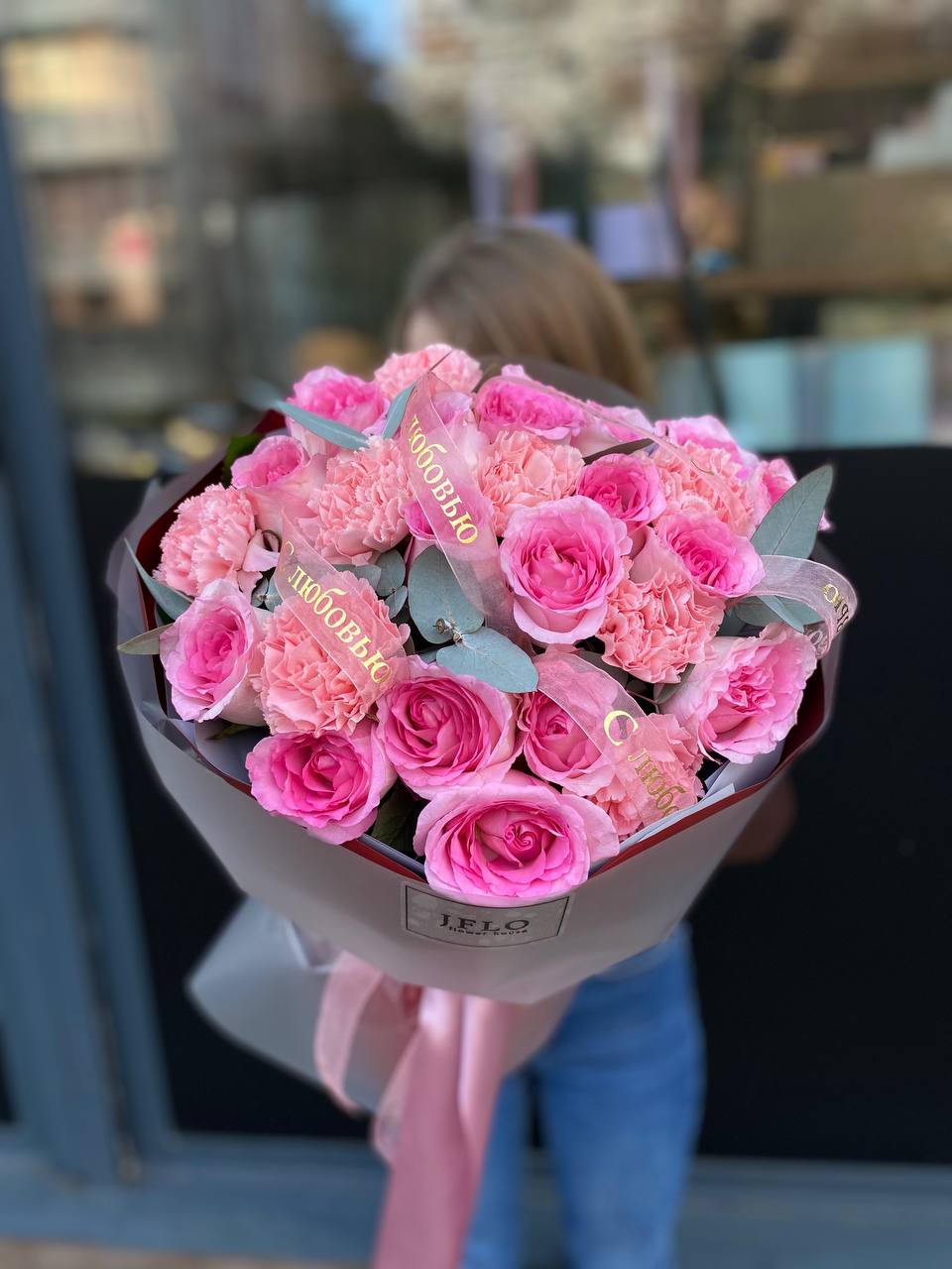 кустовые розы, гортензии, французские розы, диантусы, эустомы, лента и дизайнерская пленка.
