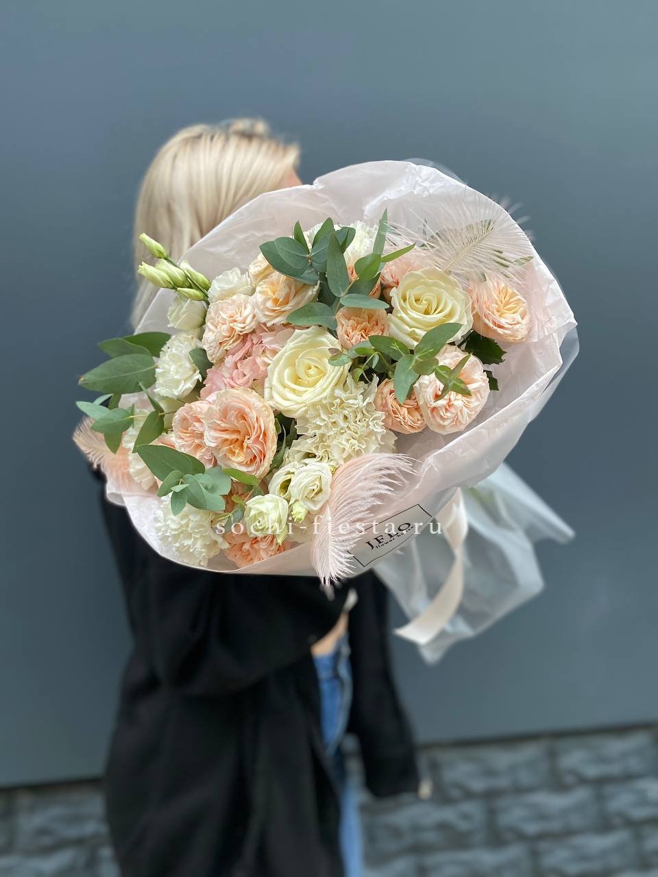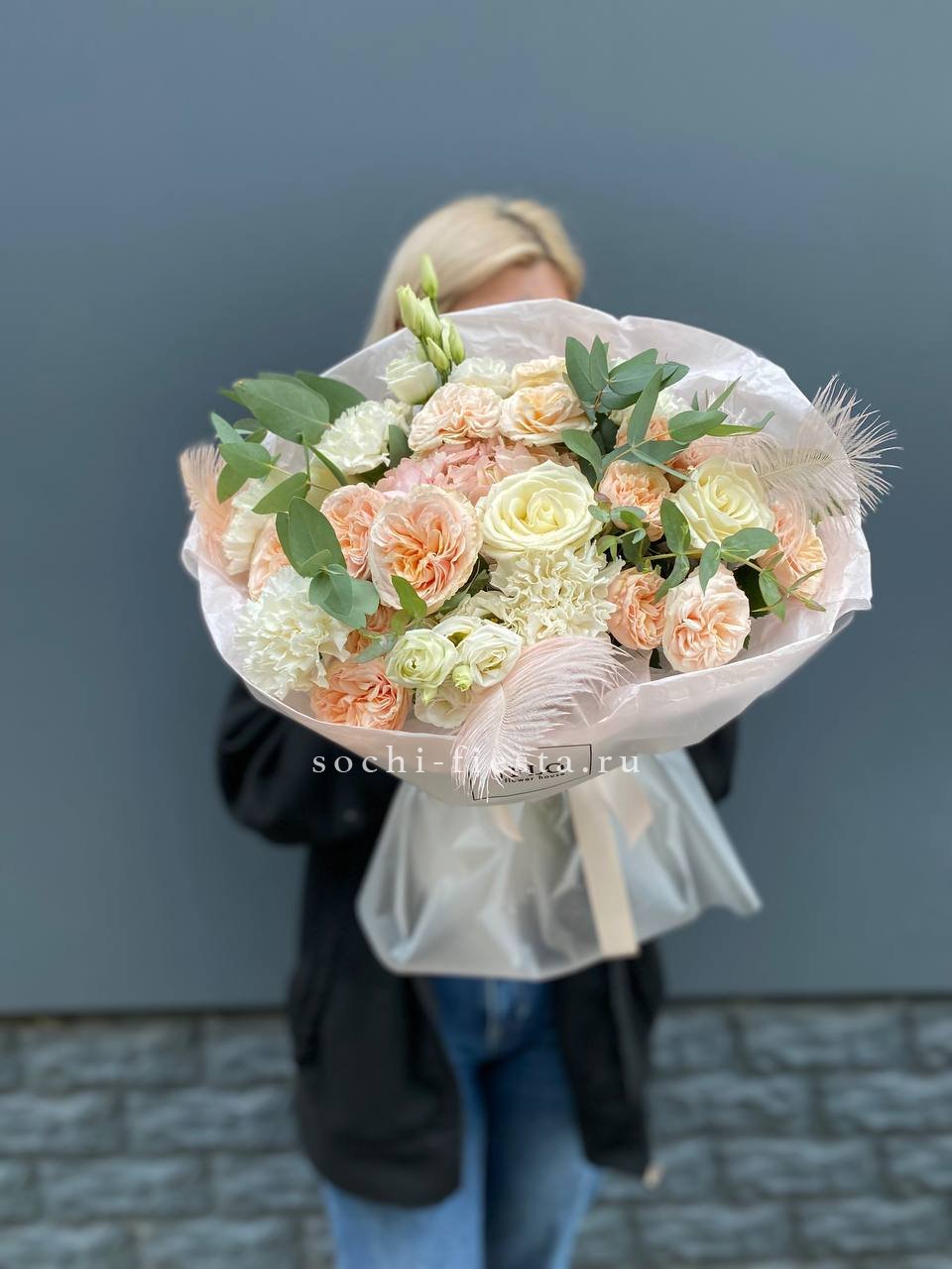 эвкалипт, гортензия, перо, кустовая роза, эустома, роза белая, диантус, упаковка.