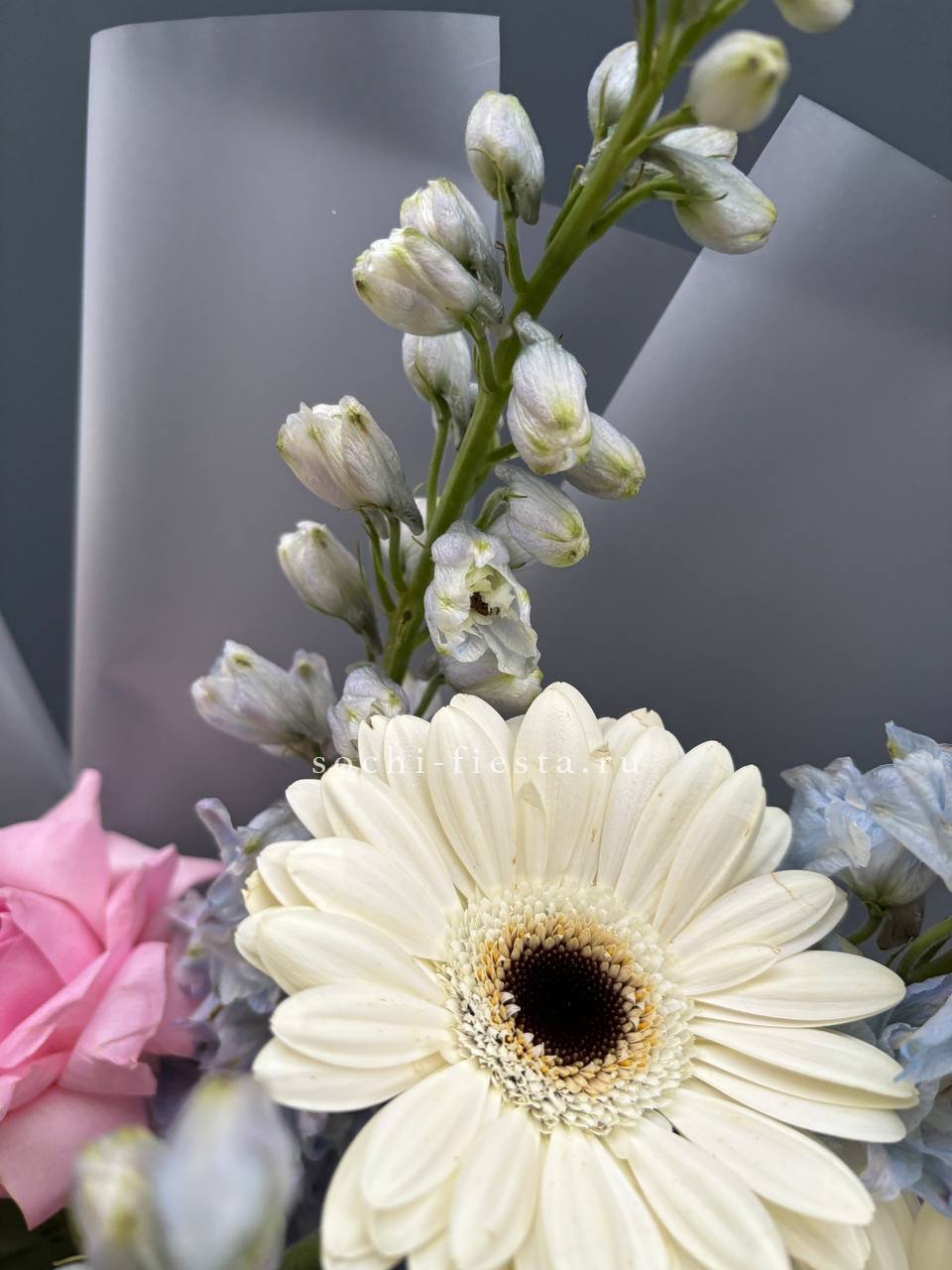 роза, герберы, дельфиниум (замена на маттиолу не в сезон), оформление.