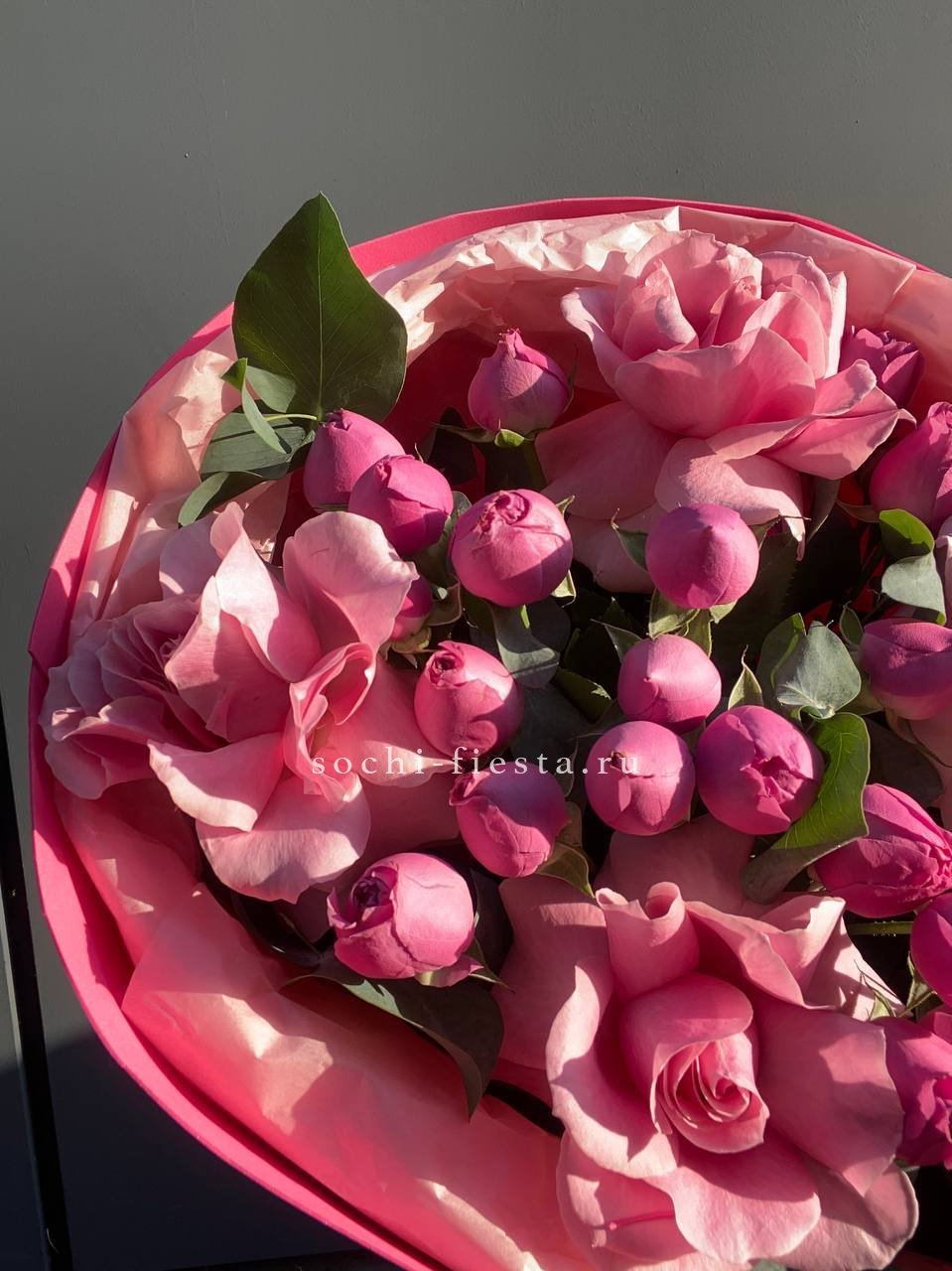 Мягкие пионовидные формы переплетаются с классическими розовыми бутонами в плотной округлой композиции. Эвкалипт освежает палитру и придаёт букету завершённость.