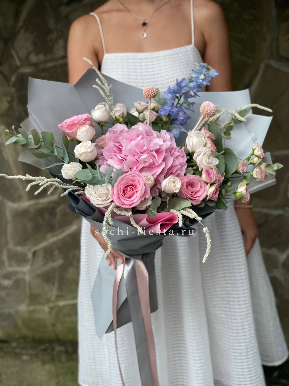 розы, гортензия, альстромерии, маттиола лента и дизайнерская пленка.