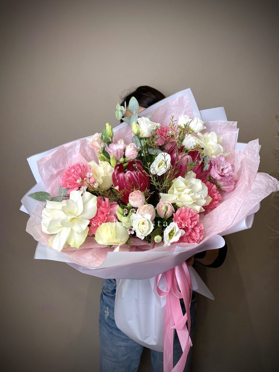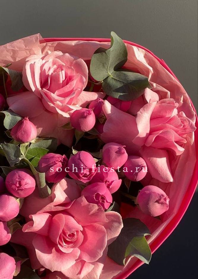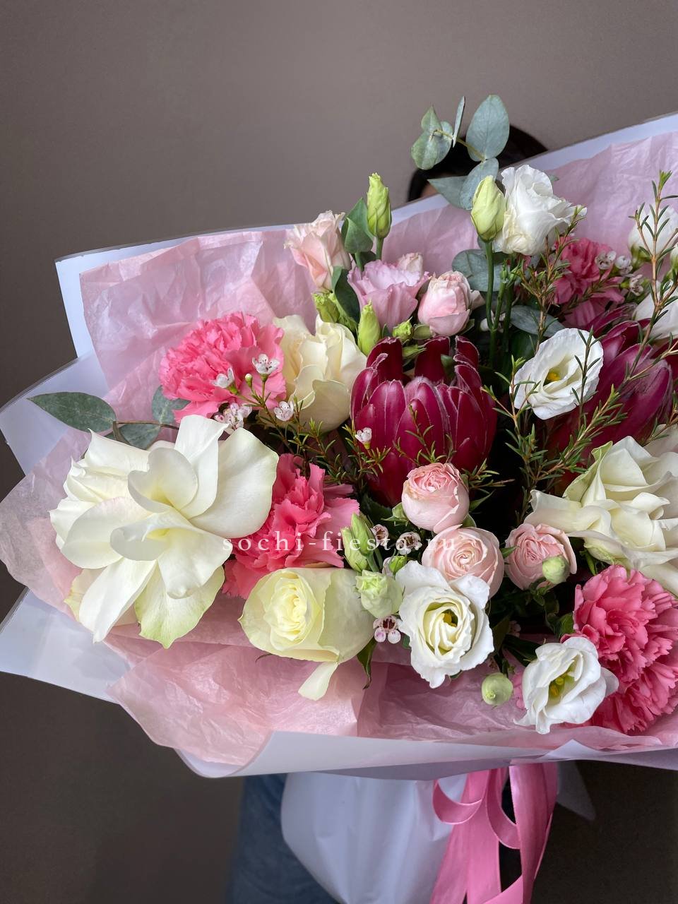 розы одноголовые, кустовые розы, озотамнус, диантусы, эвкалипт, лента, дизайнерская упаковка.