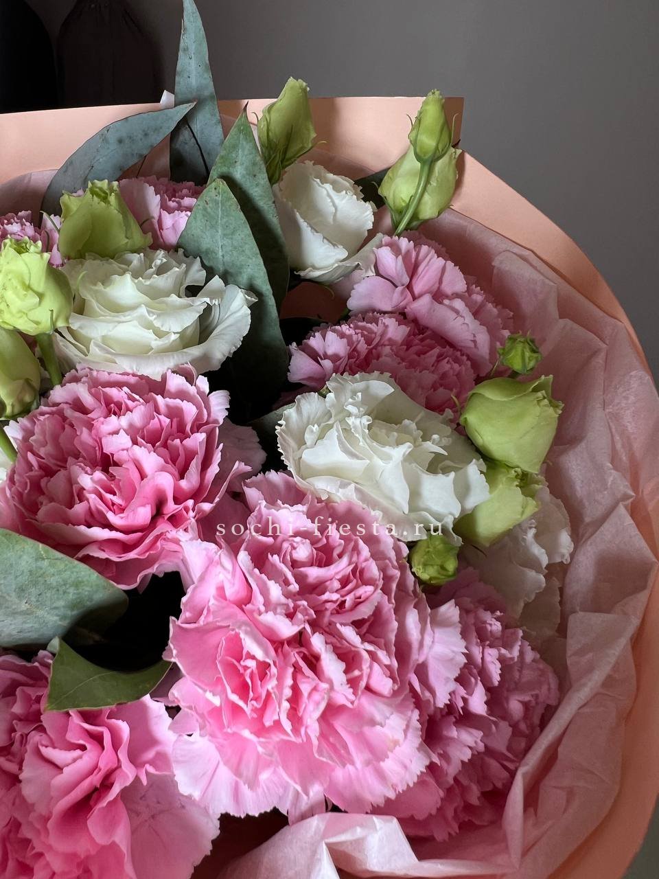 Пионовидные розы раскрываются широкими бутонами среди воздушных соцветий гортензии и многолепестковой эустомы. Эвкалипт добавляет свежести линиям, а дизайнерская упаковка завершает композицию.