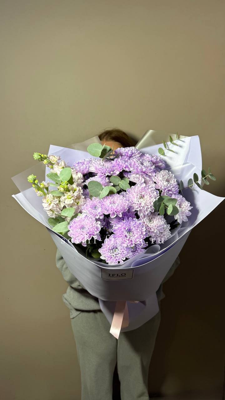 Кустовая хризантема и маттиола образуют гармоничную пару с разной фактурой бутонов. Эвкалипт добавляет свежести и завершает композицию естественными линиями.