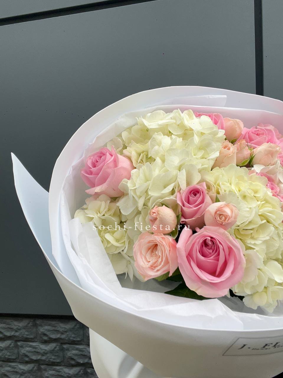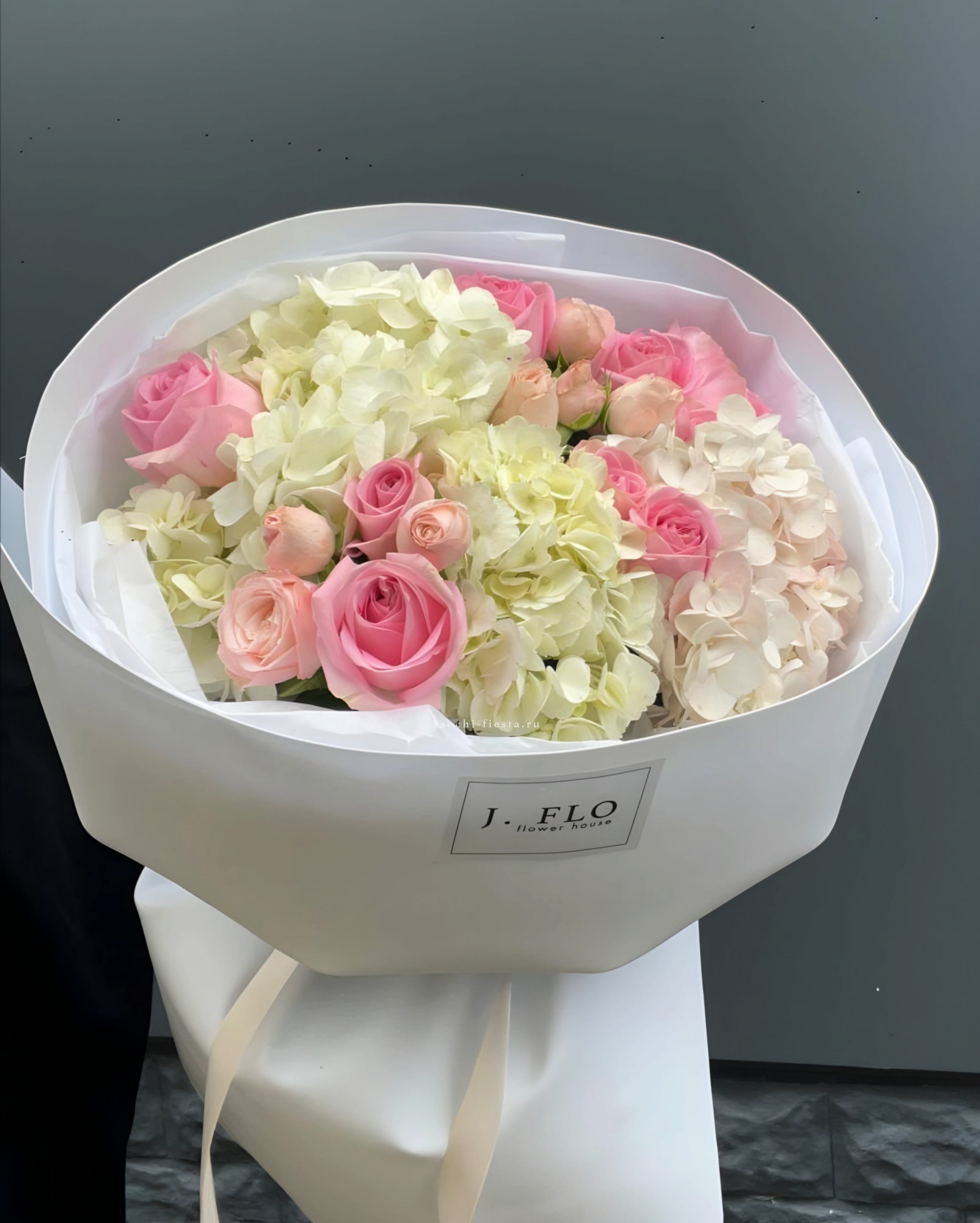 Воздушная композиция с белоснежной гортензией и пионовидными розами в окружении эвкалипта и пампасной травы. Светлая палитра и природная текстура создают ощущение летнего сада. Гармония форм и естественная свежесть в каждом элементе.