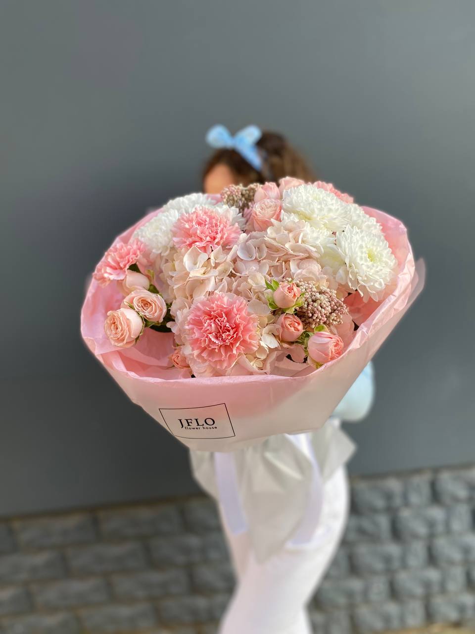 гортензия, пионовидная кустовая роза Мисти Баблс, лента, дизайнерская упаковка.
