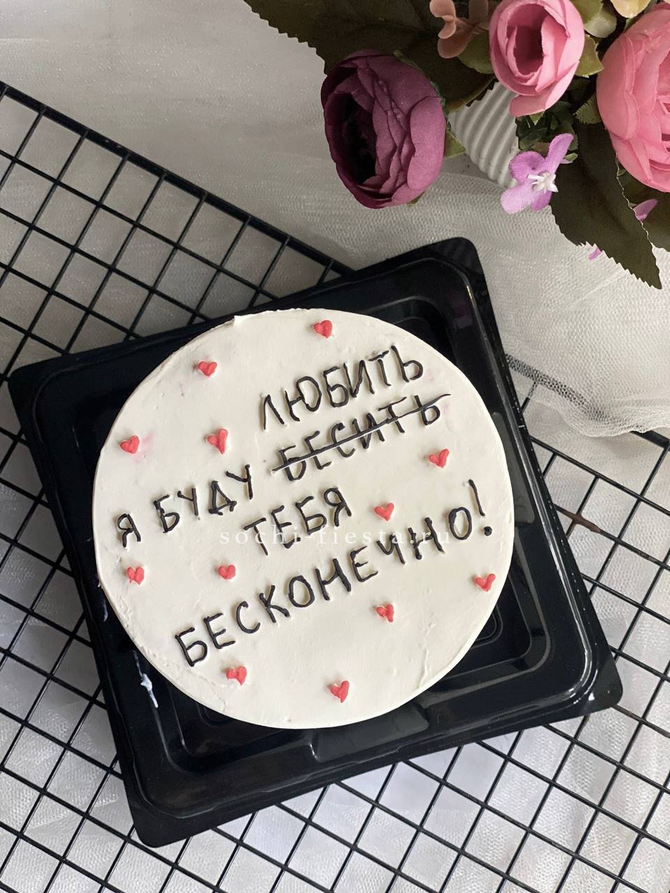 Компактный десерт с лаконичным декором и ироничной надписью. Доступен в двух вкусах: освежающий клубничный пломбир или насыщенный шоколадный трюфель. Весит около 400 граммов и готов к подаче без лишних хлопот.